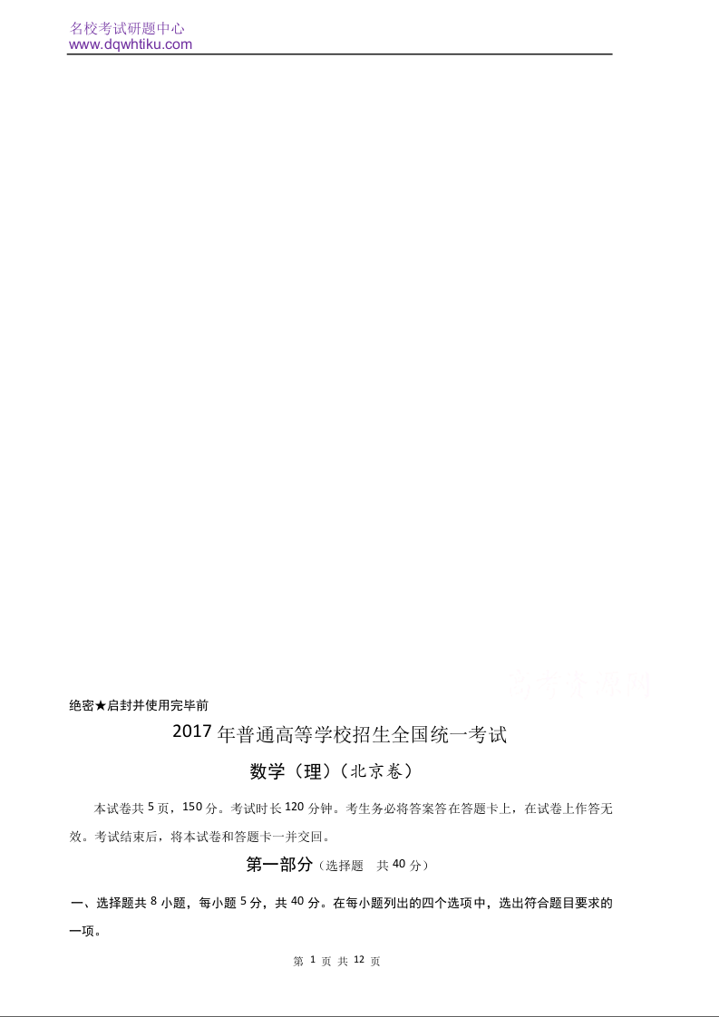 2017年北京高考理科数学试题及答案