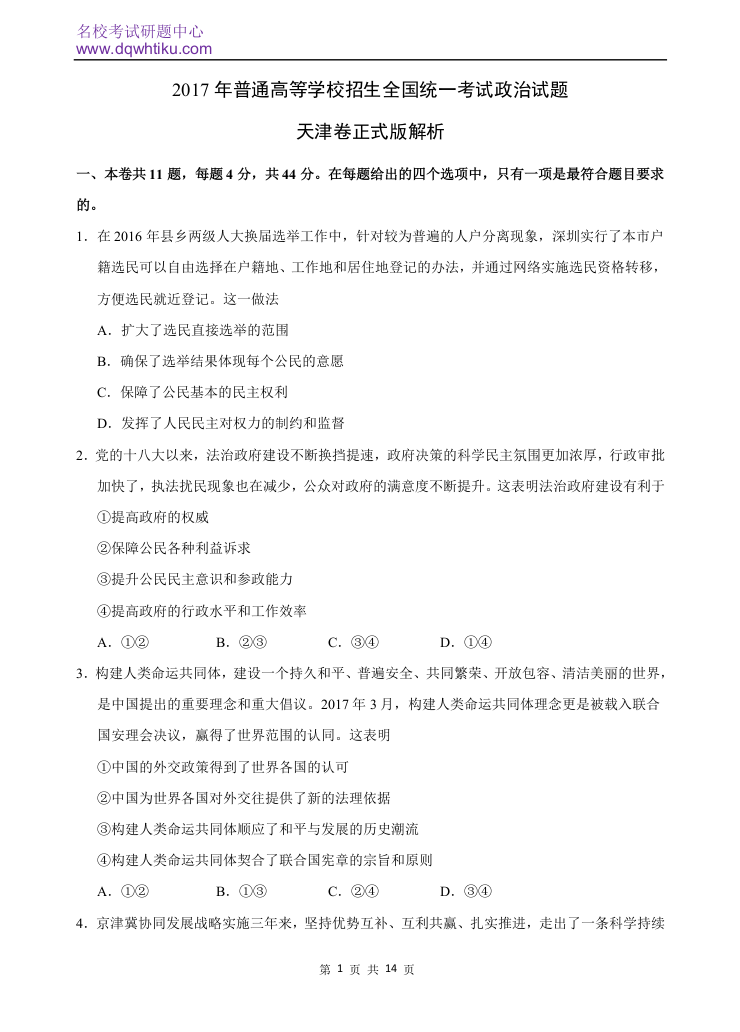 2017年政治高考真题--天津卷