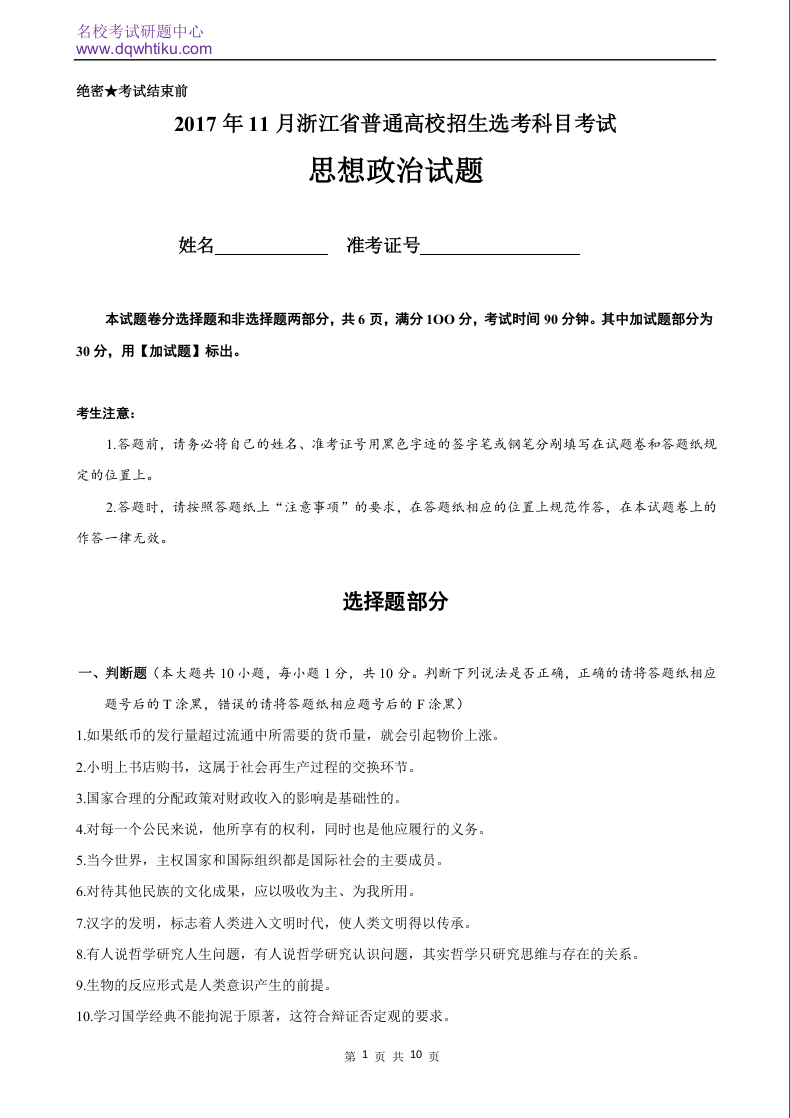 2017年政治高考真题--浙江11月选考