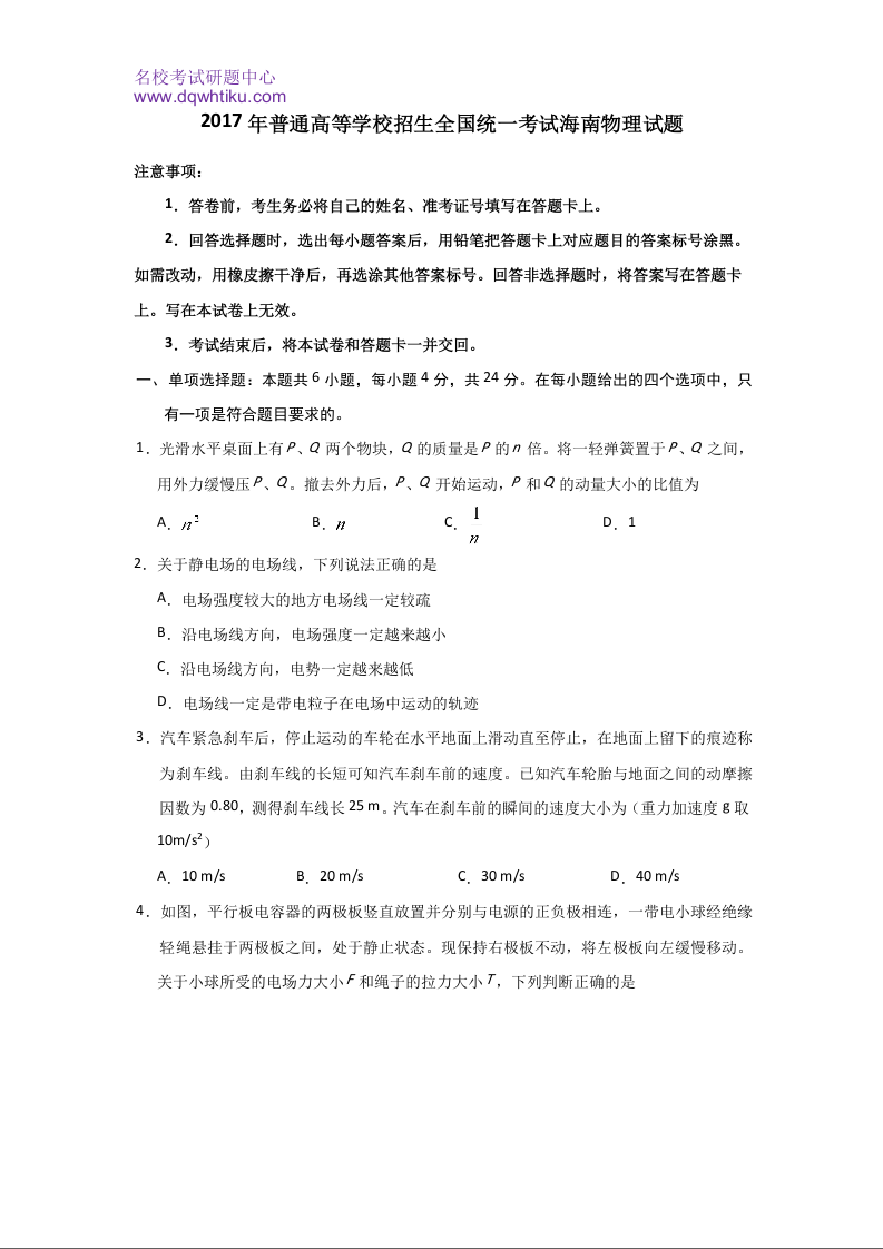2017年海南高考物理试题及答案
