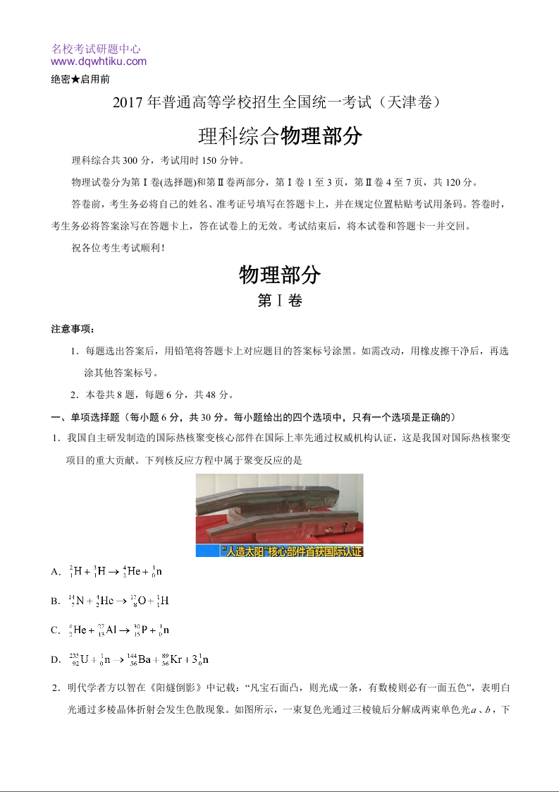 2017年天津高考物理试题及答案