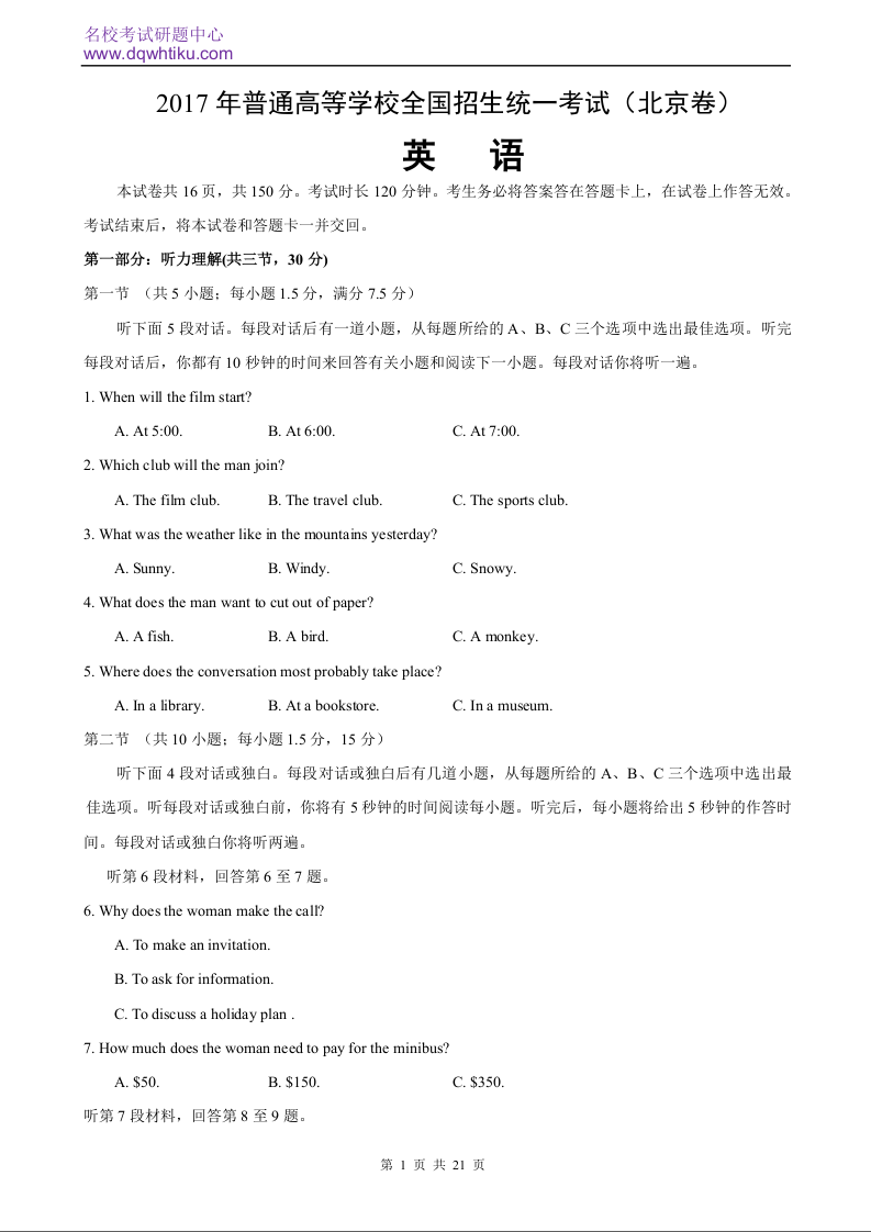 2017年北京高考英语试卷及答案