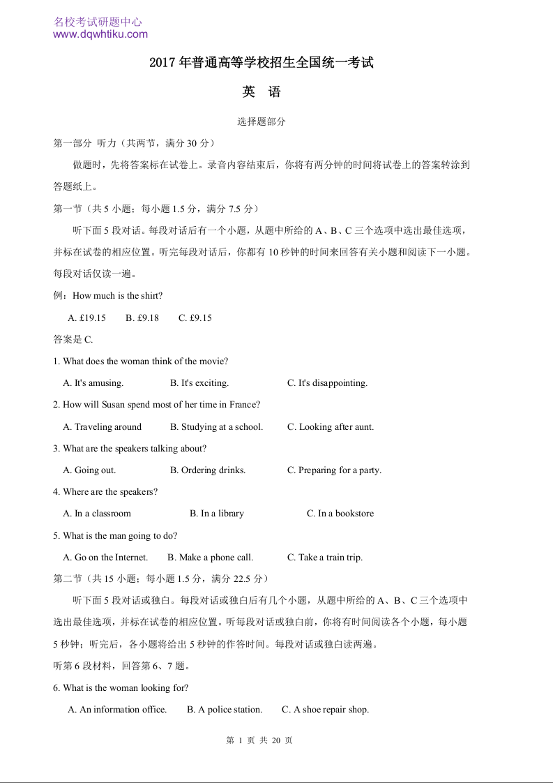 2017年全国高考浙江省英语试题及答案