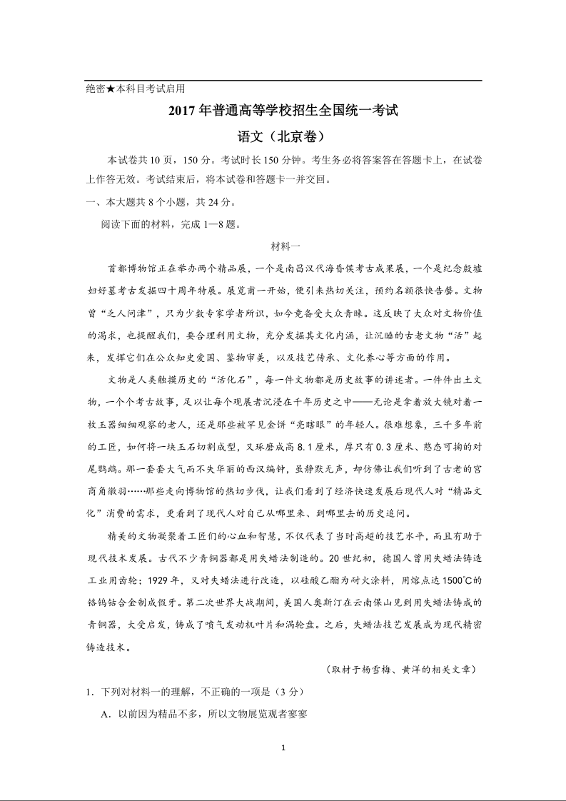 2017年北京高考语文试题及答案