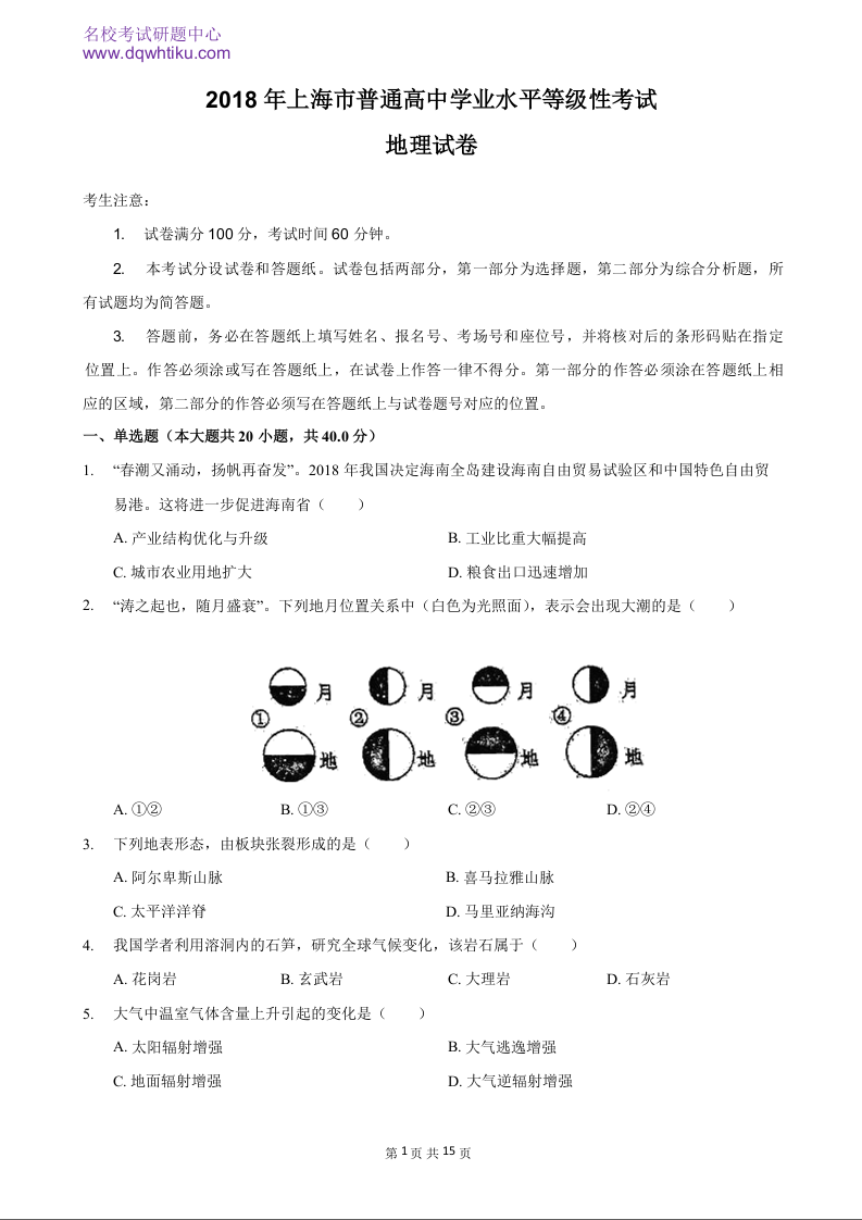 2018年地理高考真题--上海卷