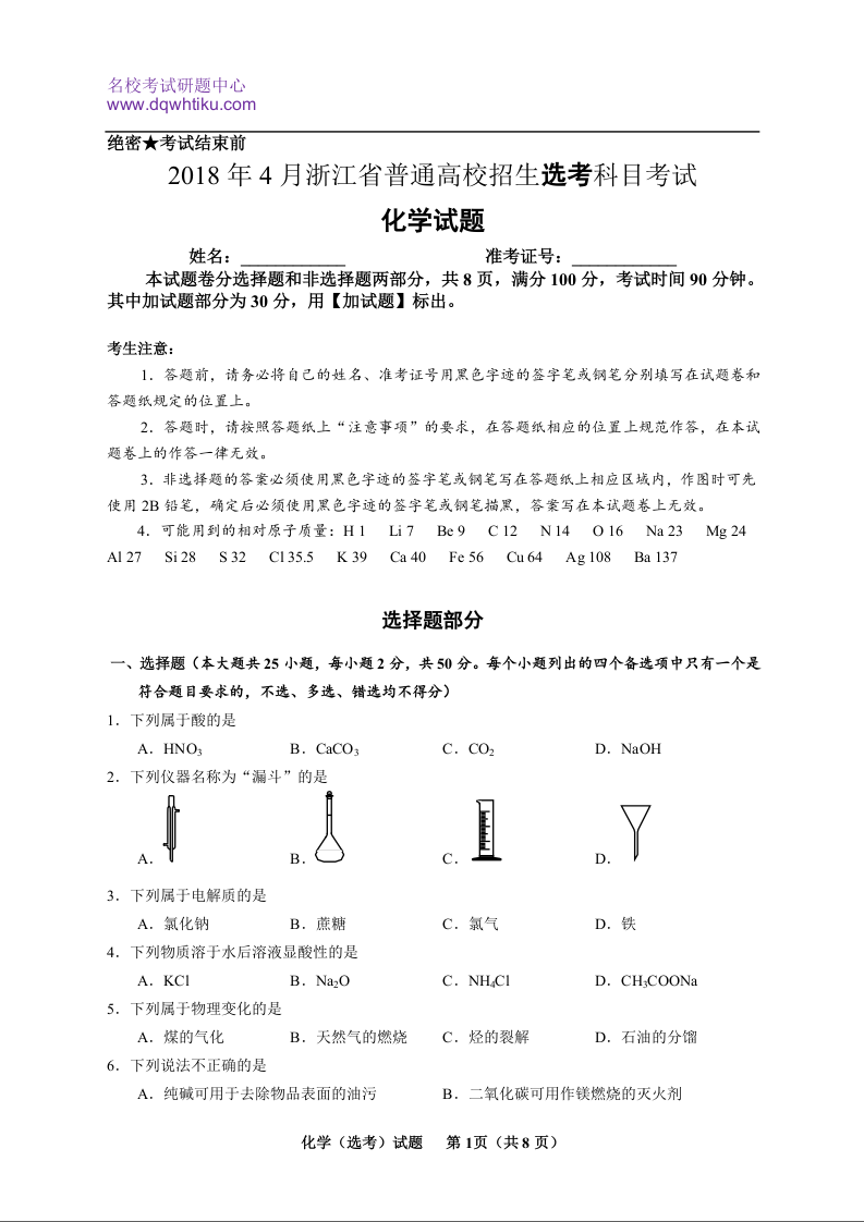 2018年4月浙江省普通高校招生选考科目考试化学试题