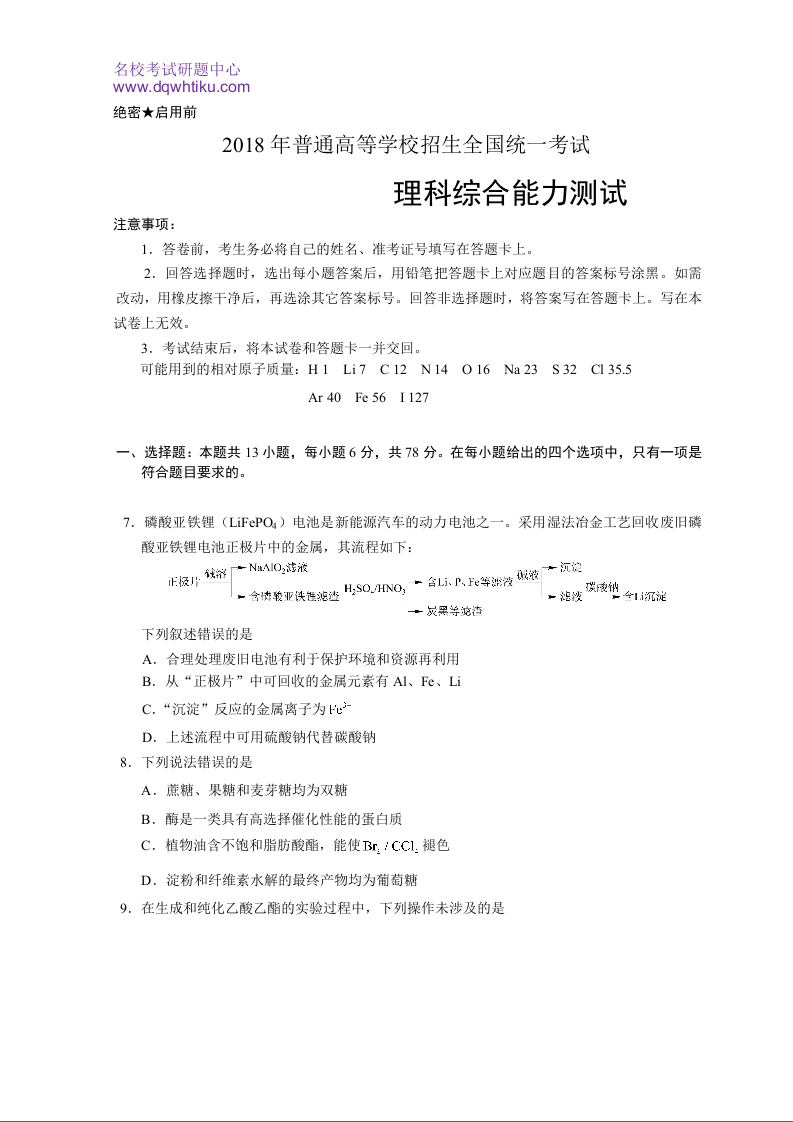 2018山东高考理综化学试题及答案