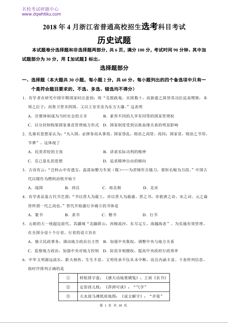 2018年历史高考真题--浙江4月选考