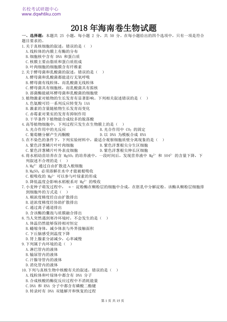 2018年高考生物真题(海南卷)