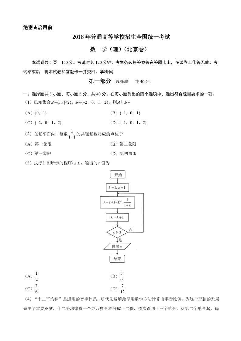 2018年北京高考理科数学试题及答案