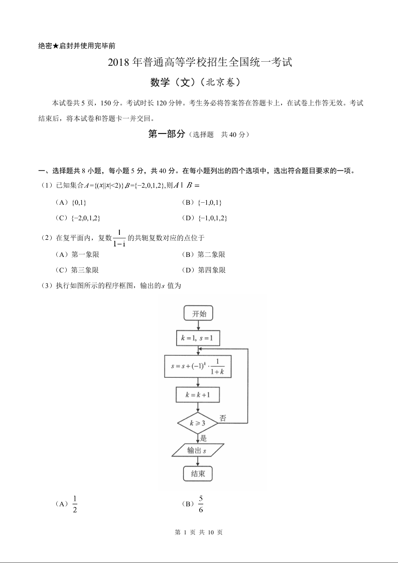2018年北京高考文科数学试题及答案