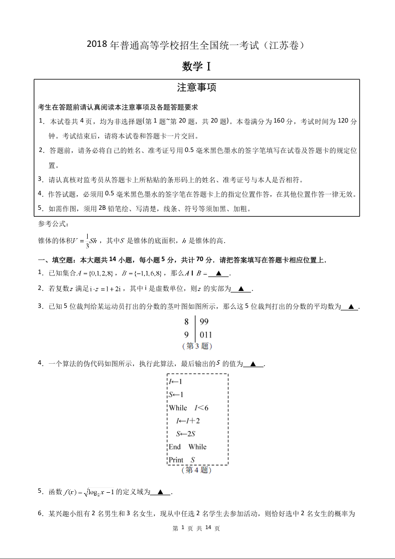 2018年江苏高考数学试题及答案