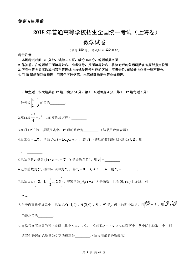 2018年上海高考数学真题试卷(word解析版)