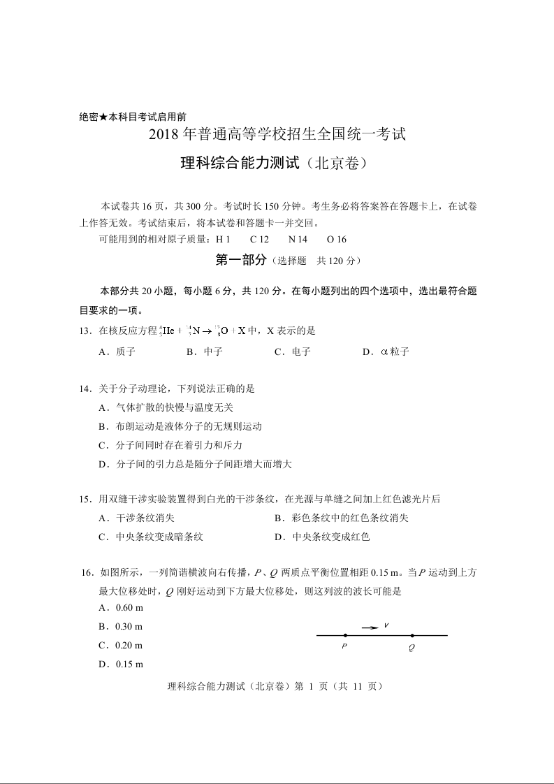 2018年北京高考物理试题及答案