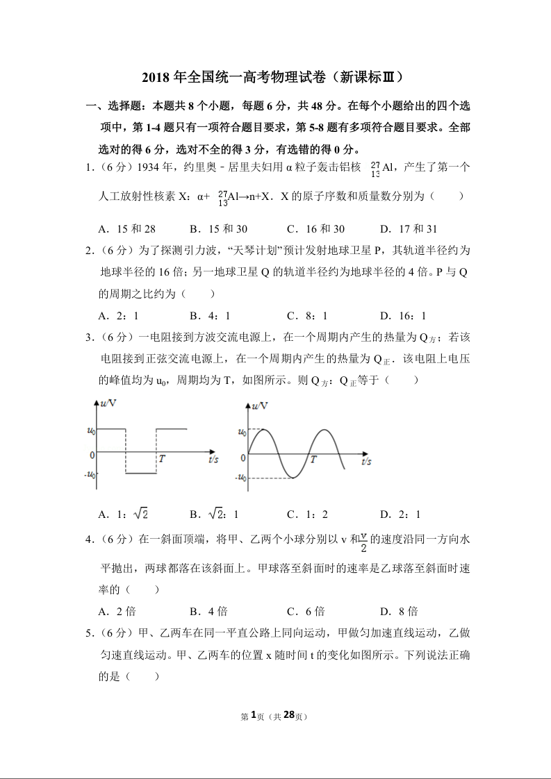 2018年全国统一高考物理试卷(新课标III)(含解析版)