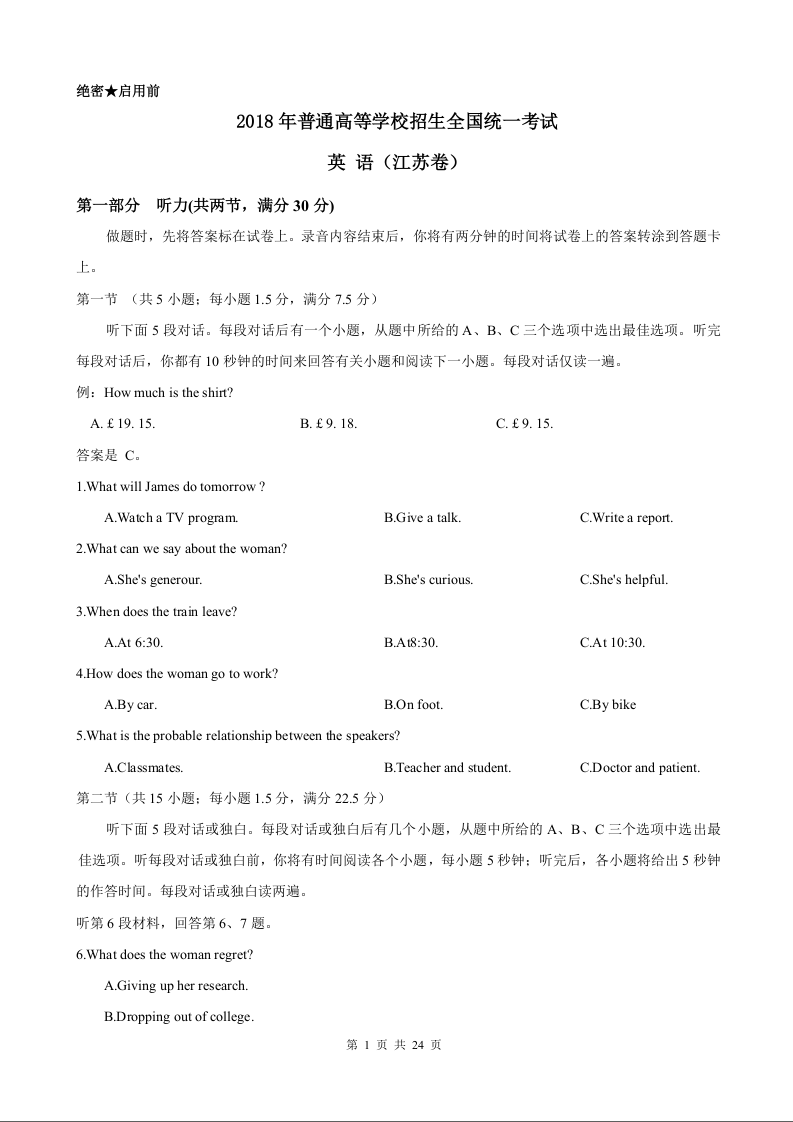 2018年高考英语(江苏卷)-Word版含答案