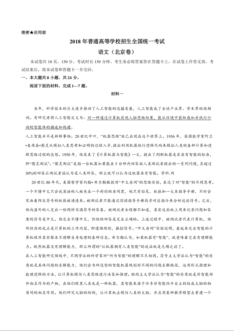 2018年北京高考语文试题及答案