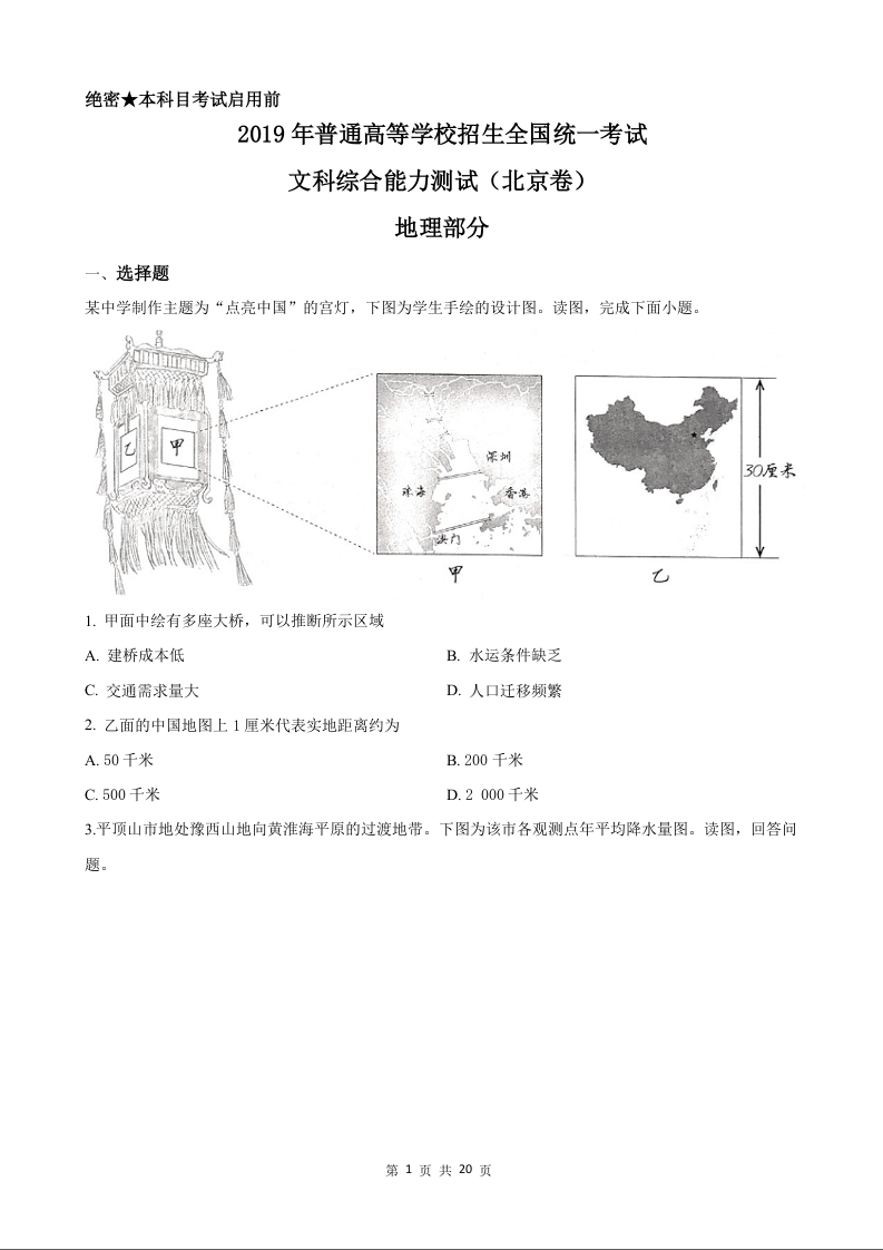 2019年地理高考真题--北京卷