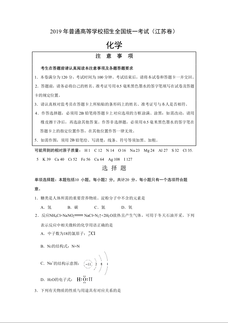 2019江苏高考化学试题及答案