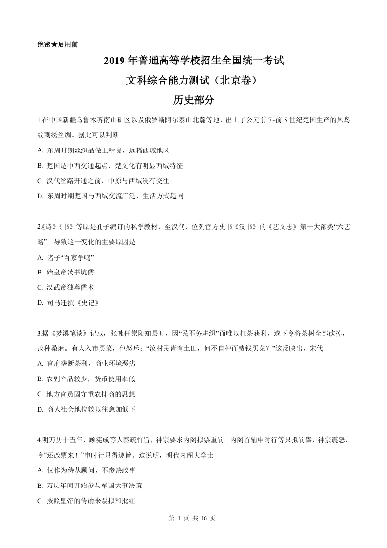 2019年历史高考真题--北京卷