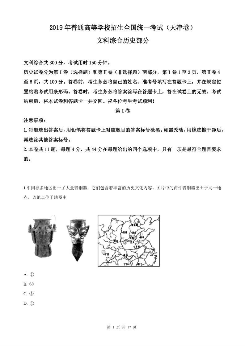 2019年历史高考真题--天津卷