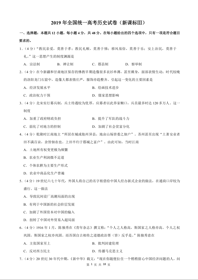 2019年历史高考真题--新课标Ⅲ卷