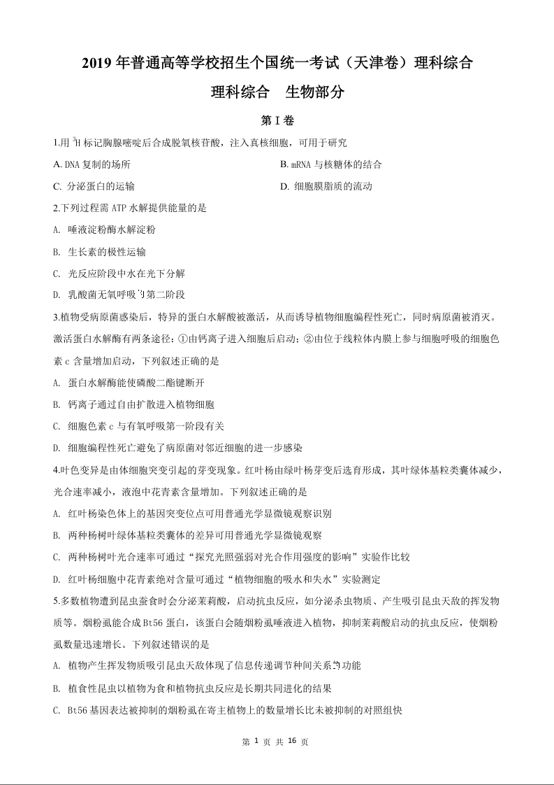 2019年高考生物真题(天津卷)