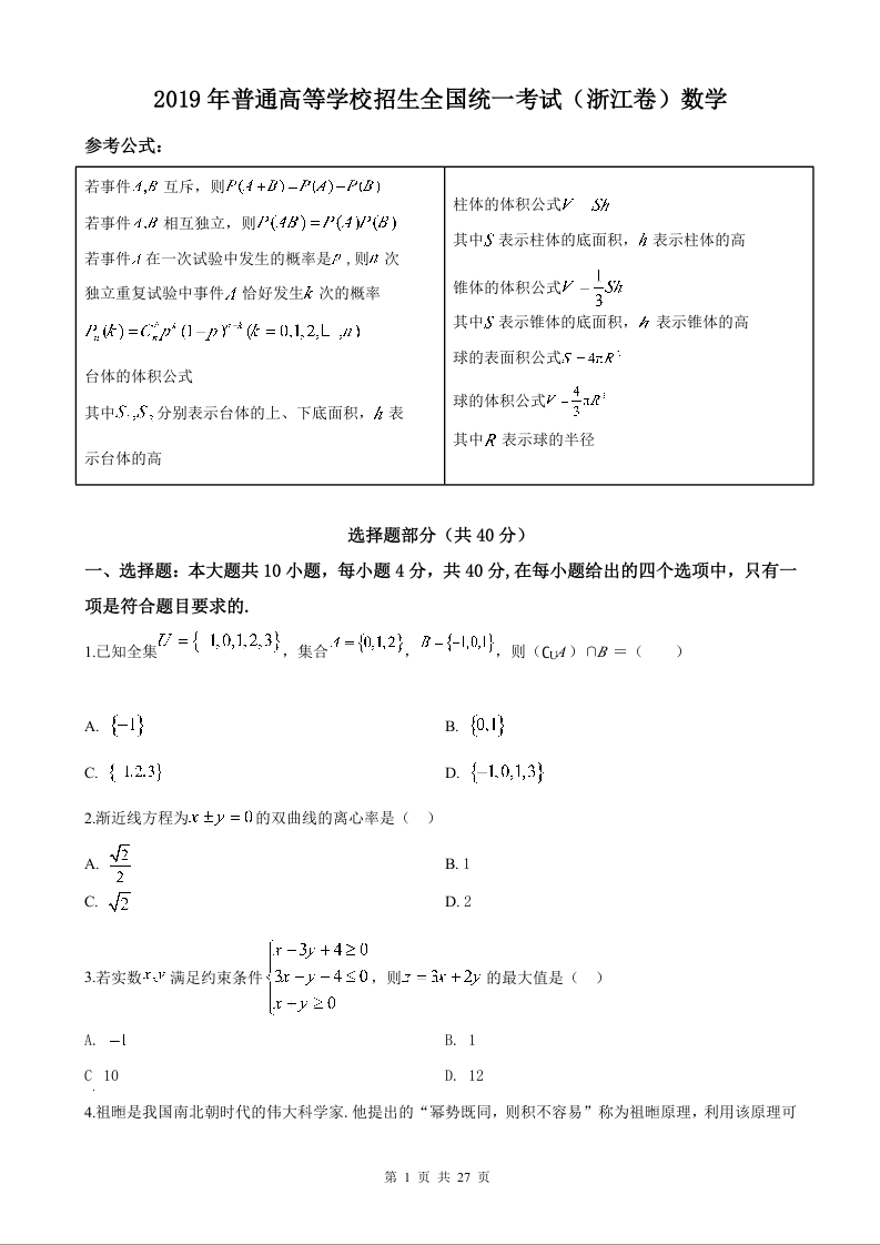 2019年高考浙江高考数学试题及答案(精校版)