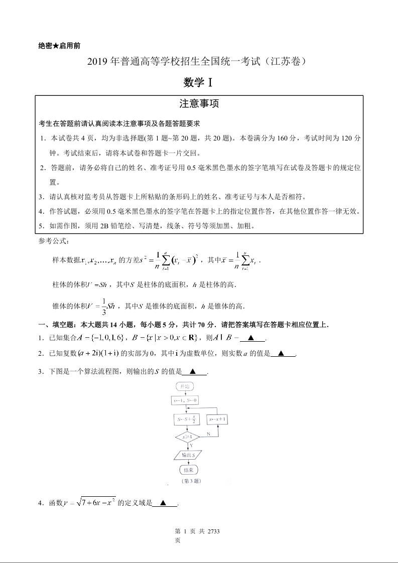 2019年江苏高考数学试题及答案