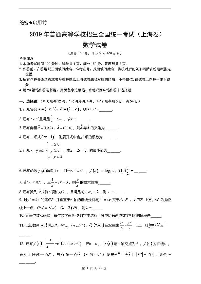 2019年上海高考数学真题试卷(word解析版)