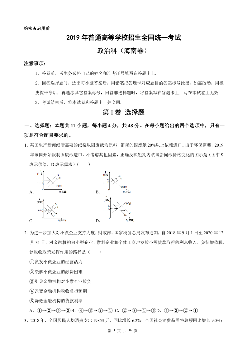 2019年政治高考真题--海南卷