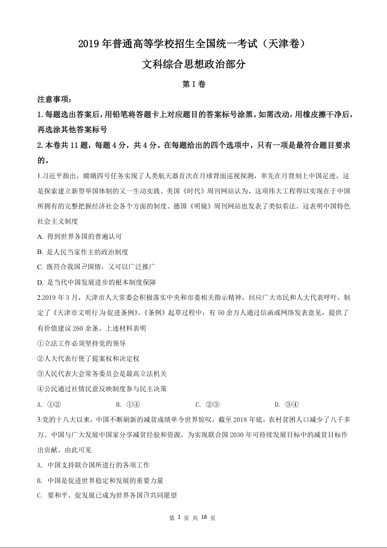 2019年政治高考真题--天津卷