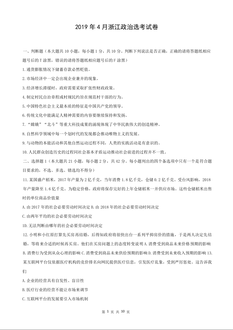 2019年政治高考真题--浙江4月选考