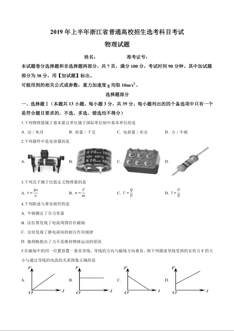 2019年4月浙江省选考物理试题(word精校版)