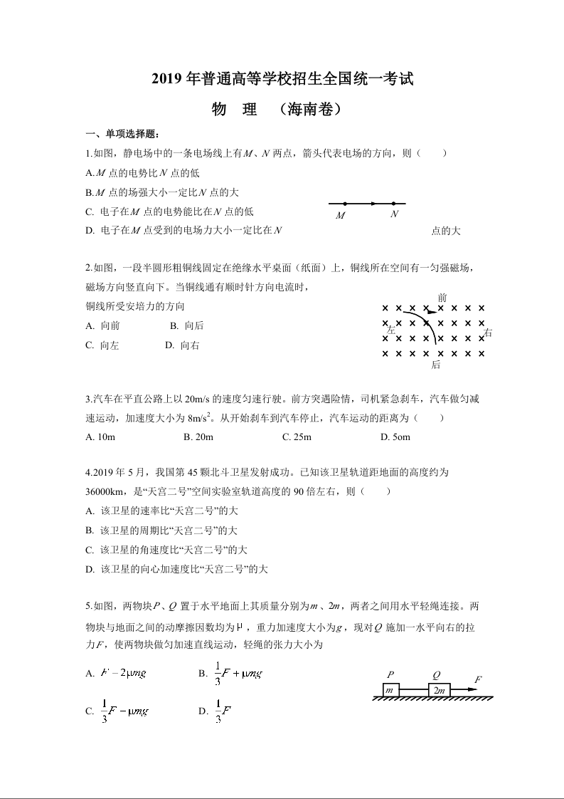 2019年海南高考物理试题及答案