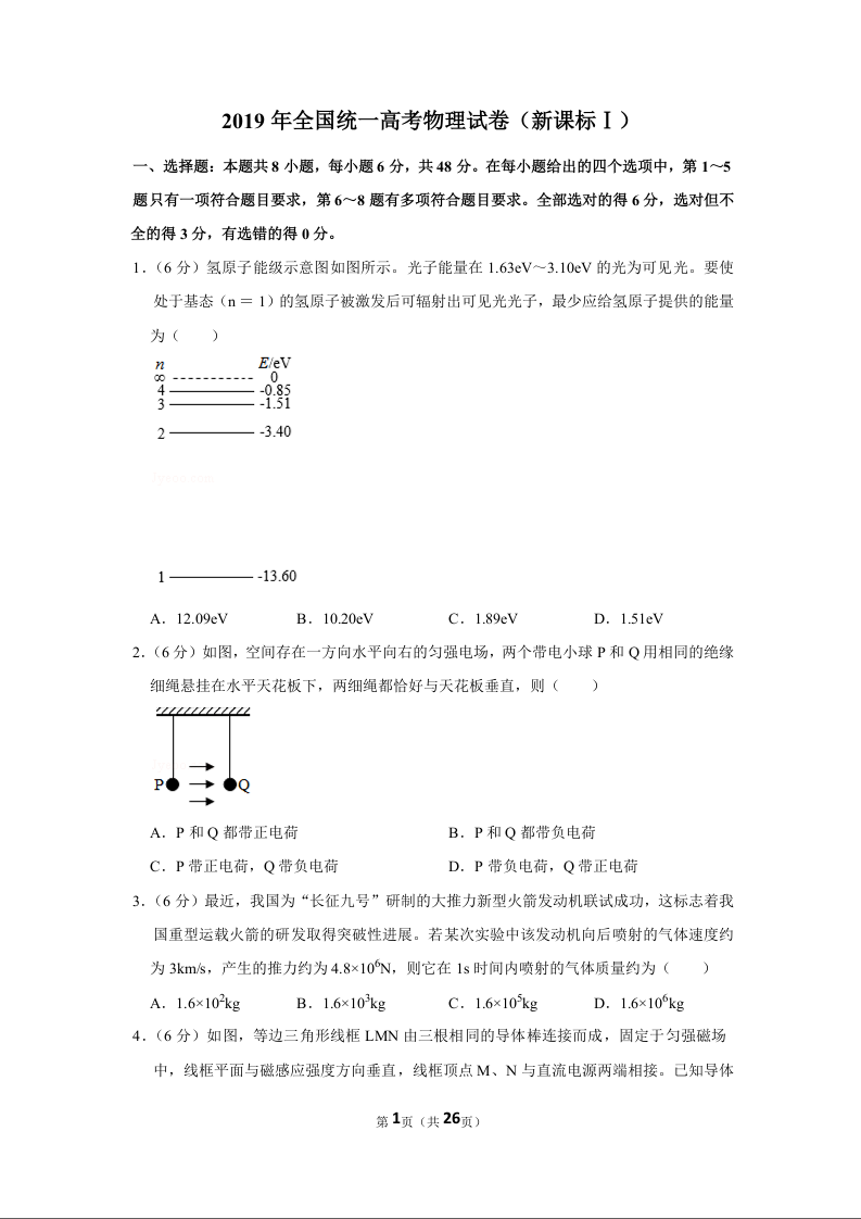 2019年全国统一高考物理试卷(新课标ⅰ)(含解析版)