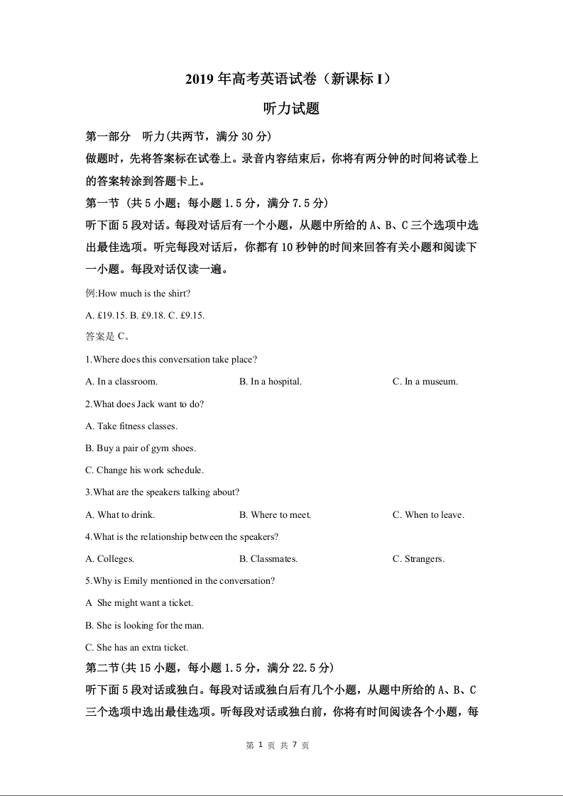 2019年高考英语试卷(新课标i)答案