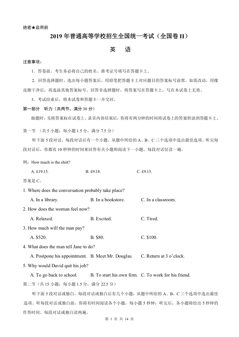 2019年海南高考英语试题和答案