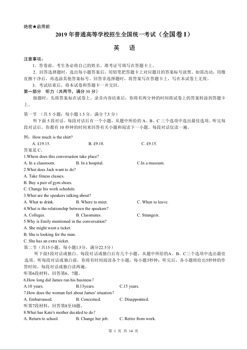 2019年山东卷英语高考试题及答案