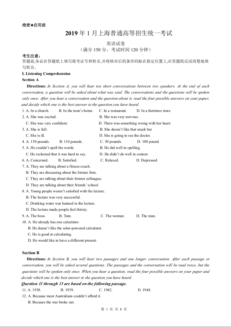 2019年上海市春季高考英语试题