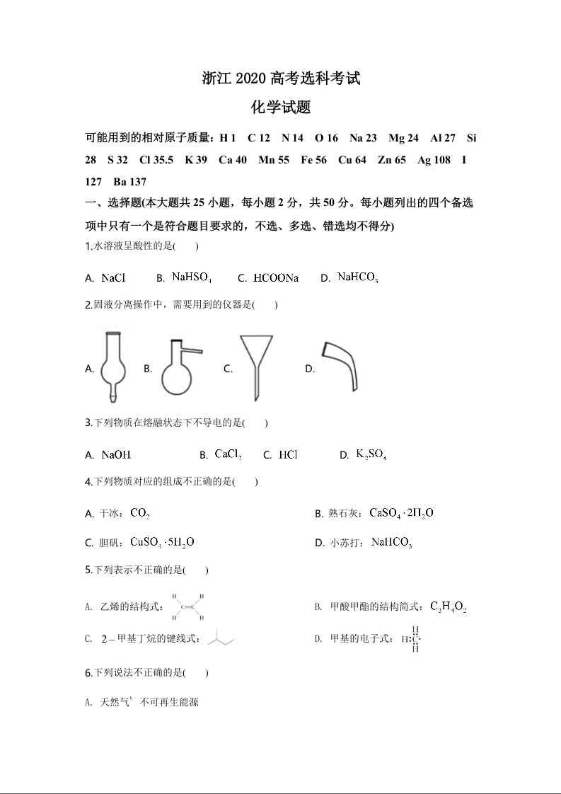 2020年7月浙江省普通高校招生选考科目考试化学试题