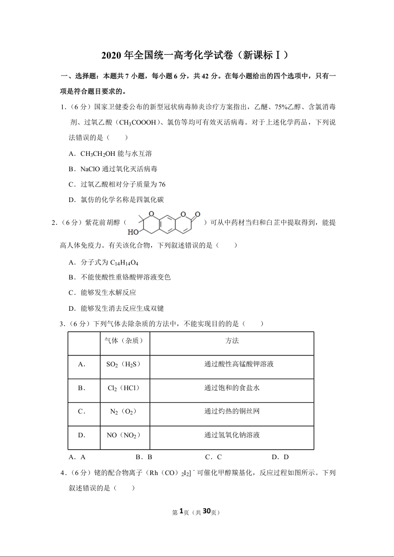 2020年全国统一高考化学试卷(新课标I)(含解析版)