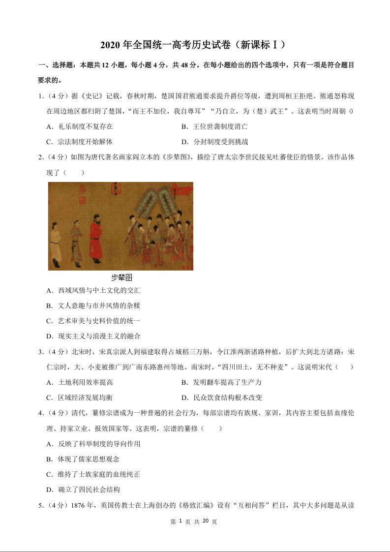 2020年历史高考真题--新课标Ⅰ卷