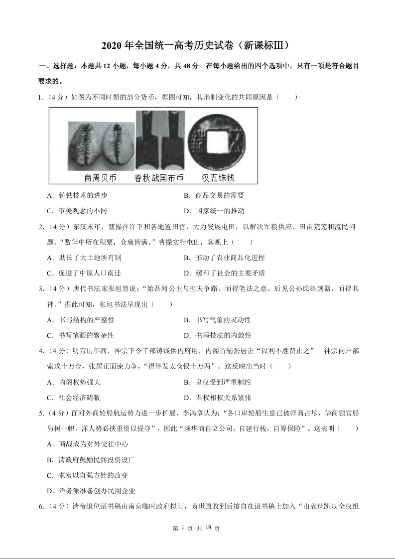 2020年历史高考真题--新课标Ⅲ卷