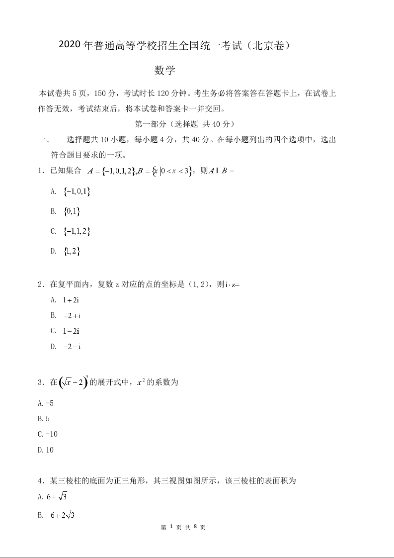 2020年北京市高考理科数学试卷