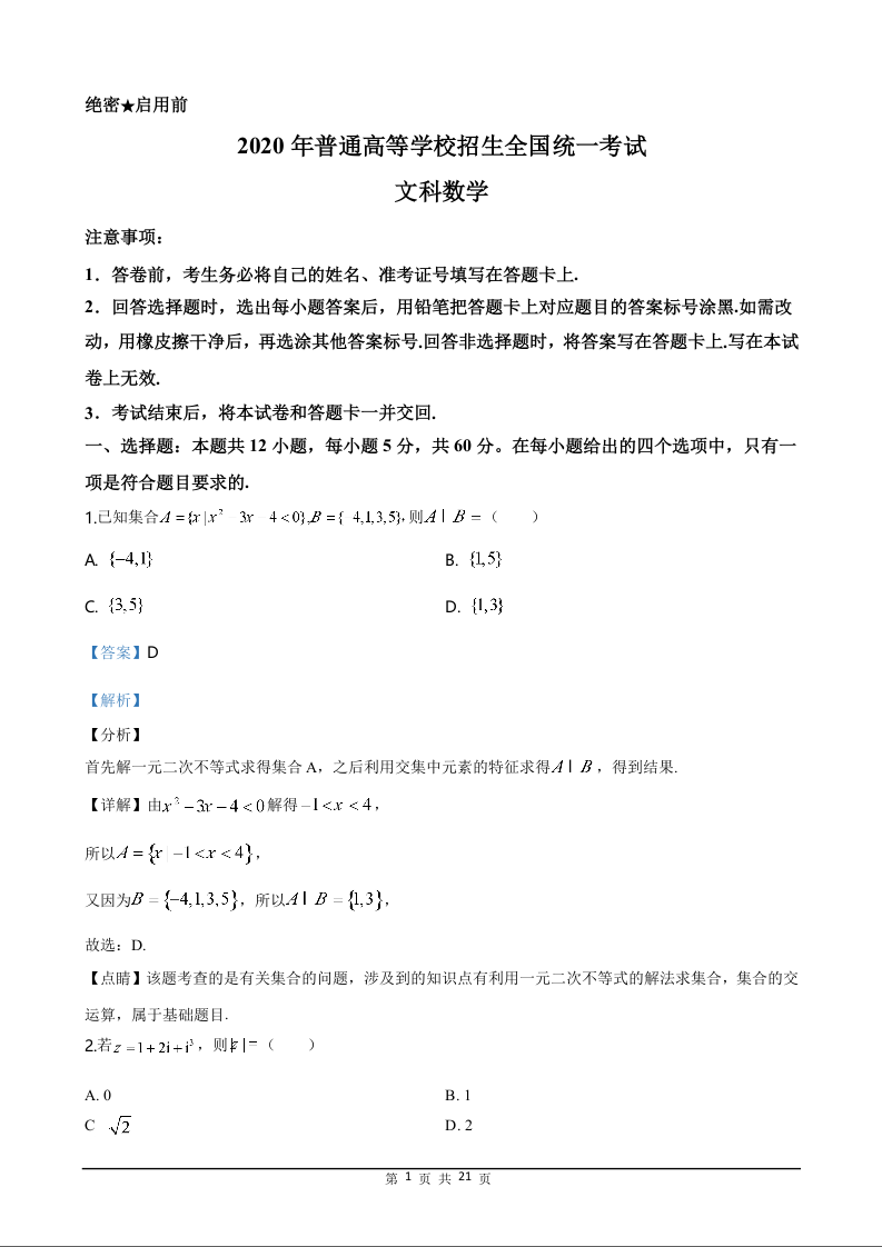2020年高考真题——数学(文)(全国卷Ⅰ)+Word版含解析