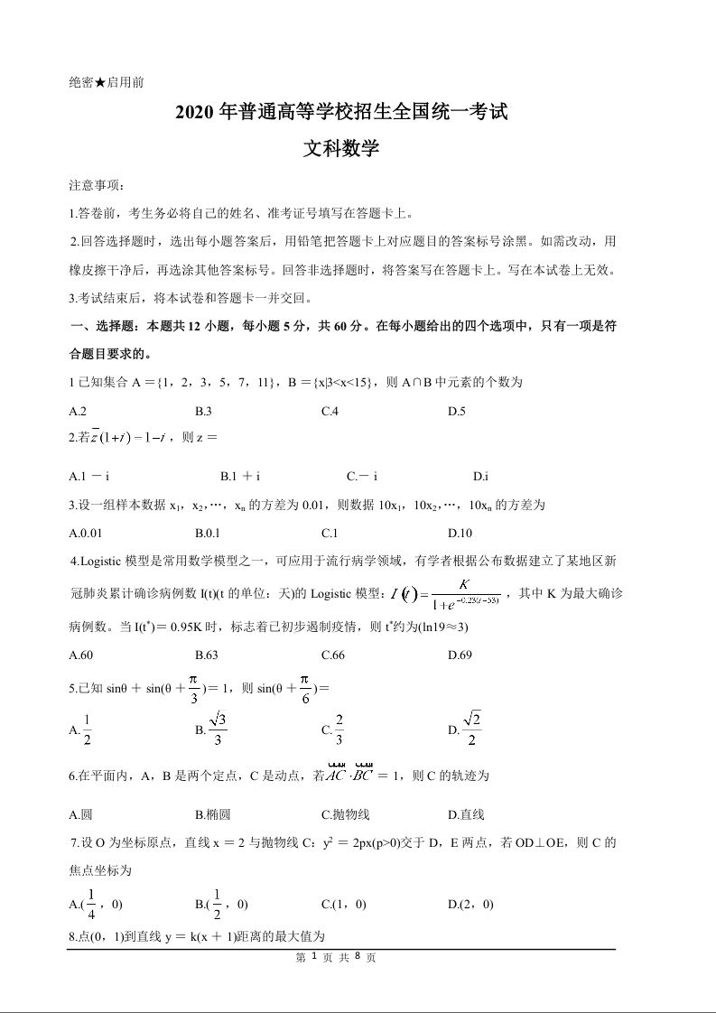 2020年高考真题——数学(文)(全国卷Ⅲ)+Word版含答案