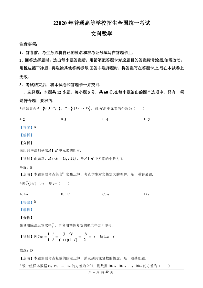 2020年高考真题——数学(文)(全国卷Ⅲ)+Word版含解析