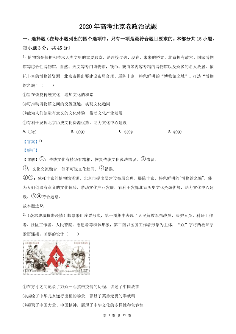 2020年政治高考真题--北京卷