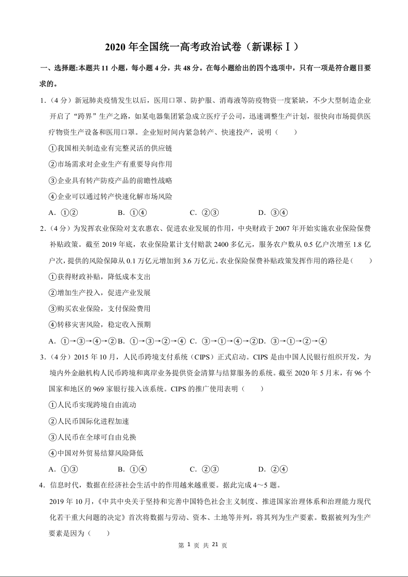 2020年政治高考真题--新课标Ⅰ卷